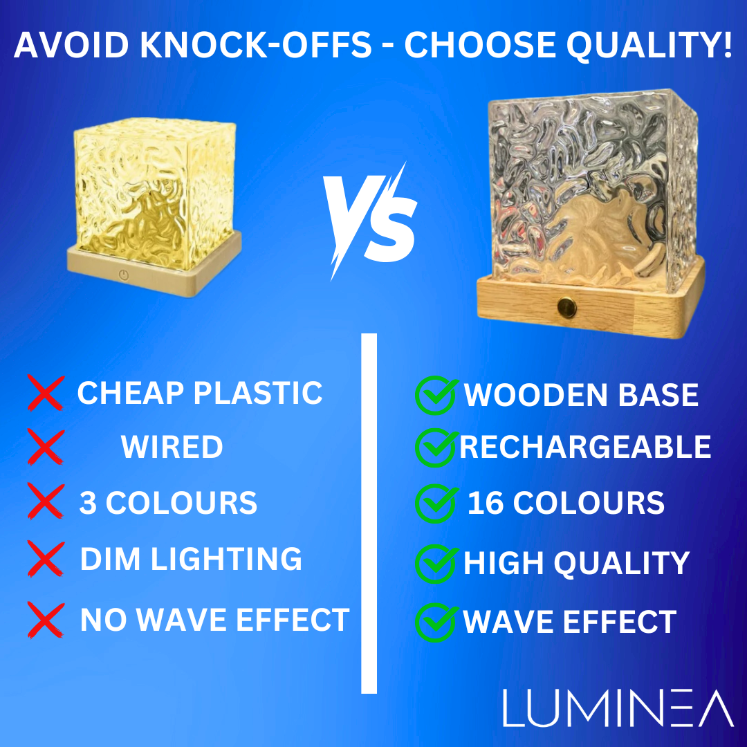 Beware of low-quality imitations! Cheap plastic knock-offs offer poor lighting. Our Serenity Cube™ has a premium hand-crafted wooden base and delivers powerful, soothing light.